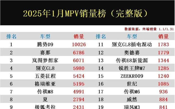 官宣: 1月MPV销量排行榜完整版, 赛那丢冠, 夏第8, 艾力绅仅第22